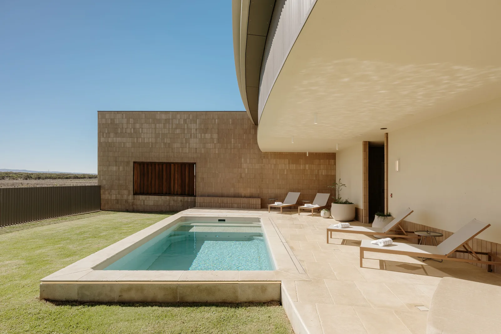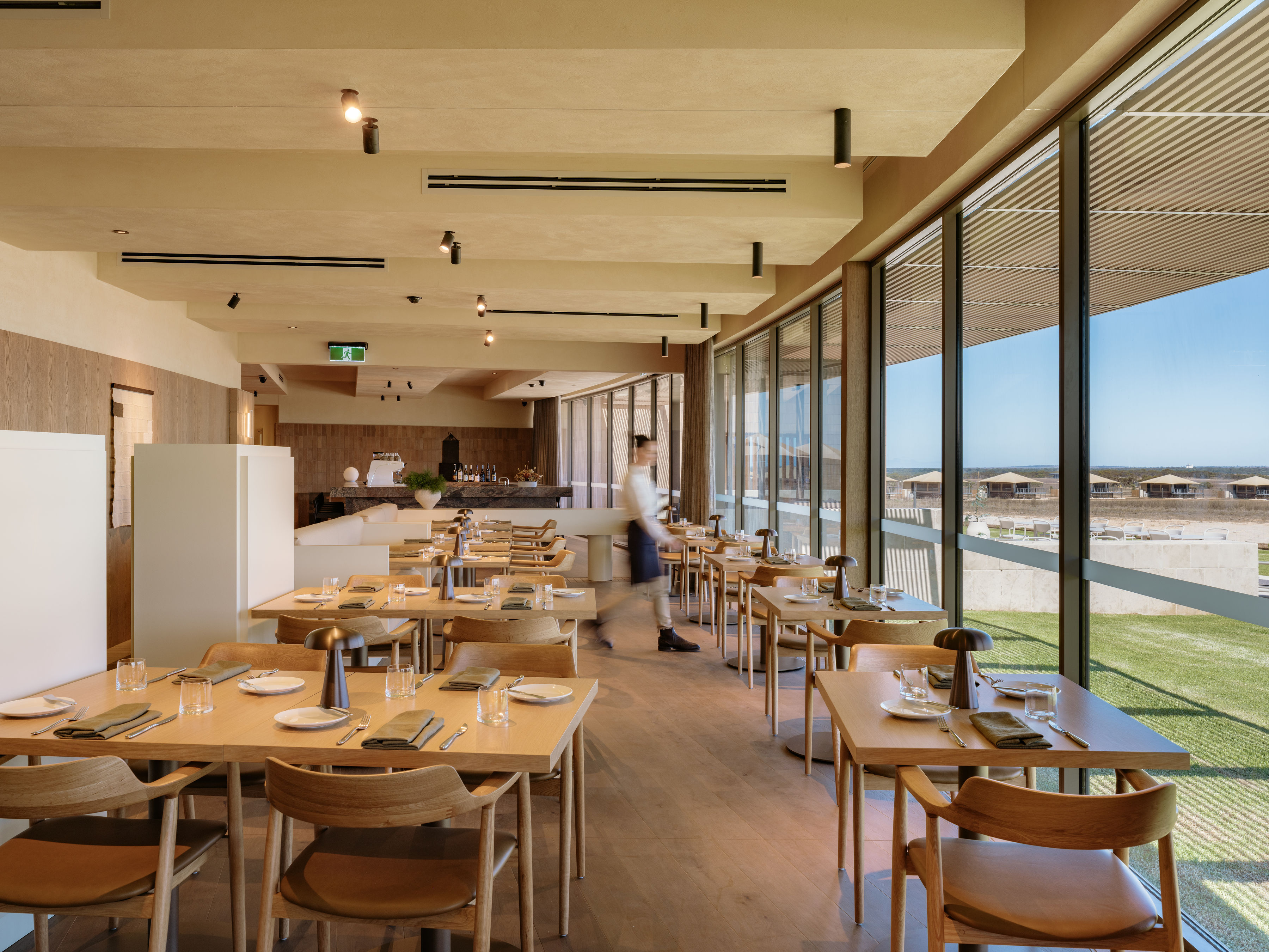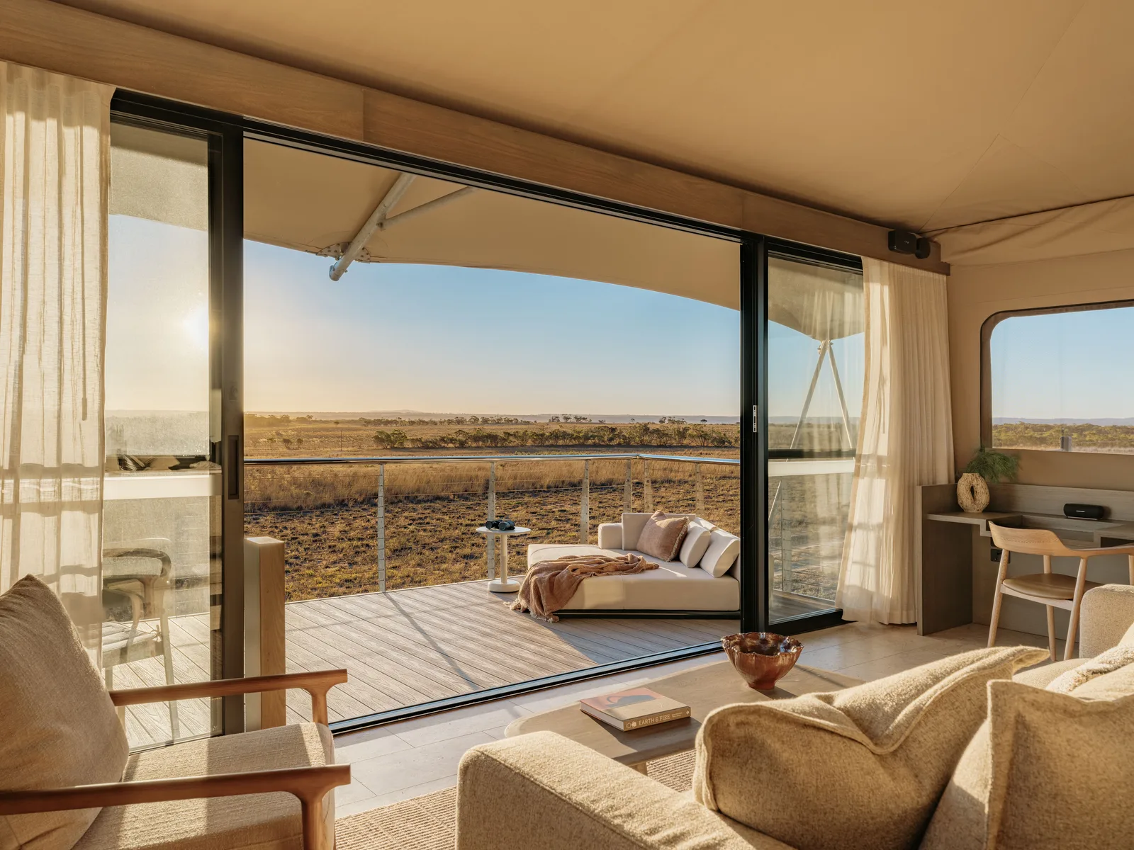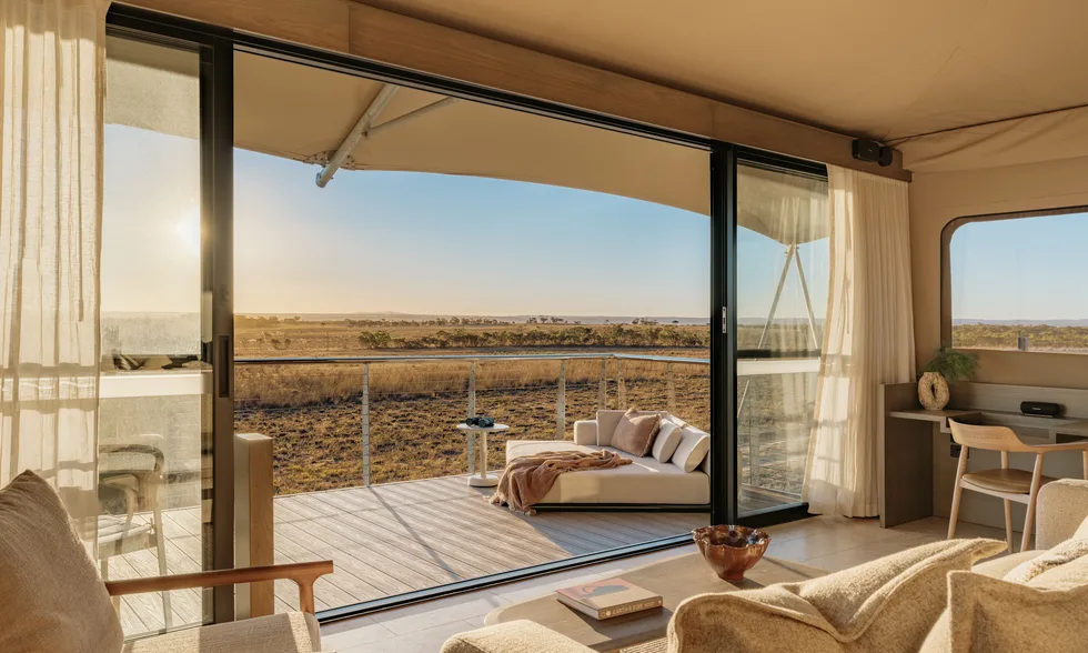 Safari Lodge, set within the Wild Africa Precinct at Monarto Safari Park, offers 20 luxurious safari tents spaced out around a central lodge with an exclusive restaurant, plunge pools, gym, pickleball court, and outdoor lounges for relaxation.