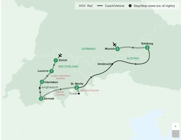 Two-night stays in Interlaken, Zermatt, St. Moritz, Salzburg and Munich; and one-night stays in Zurich, Lucerne 18 meals - 12 breakfasts and 6 dinners Services of a Travelmarvel Tour Director and expert local guides Transfers, porterage and tipping Explore nine towns, villages and cities Journey aboard the Glacier Express to St. Moritz Ride the Bernina Express, passing glaciers and rushing mountain streams Visit Neuschwanstein Castle, the inspiration for Disney's Sleeping Beauty Castle