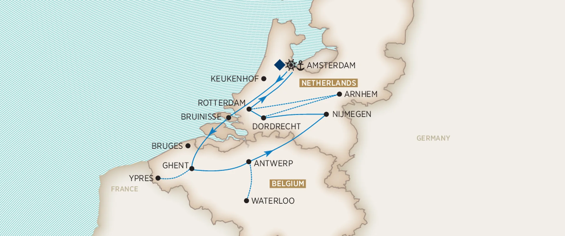 Our journey concludes this morning in Amsterdam. After breakfast, disembark and bid farewell to your fellow travellers and Historian. Take with you the memories of sacred sites visited, stories shared and the profound experience of commemorating Anzac Day in the places where the Anzac legend was forged.