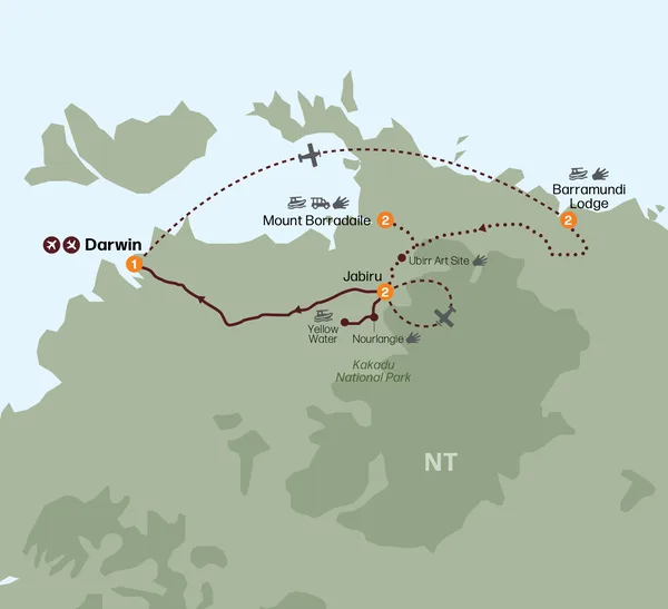 It’s an early start today as we head to the airstrip, where you’ll gain an aerial perspective on this incredible environment. Take to the skies on a 30-minute scenic flight over ancient escarpments, floodplains and winding rivers, exhibiting the results of 1.8 billion years of continuous erosion. Setting our sights for Darwin, we will cross the South Alligator River with its expansive wetlands which, for many years, were used for buffalo hunting. We’ll travel via Humpty Doo before arriving into Darwin, where our tour ends. Here, there is the option of being transferred to your city centre hotel if you are staying longer, or the airport for your flight home.
