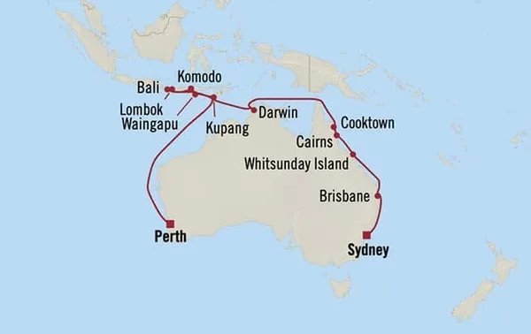 Journey from Australia’s iconic east coast to the Indian Ocean on this captivating 23‑day voyage. Discover vibrant cities, tropical Queensland, the Top End and Indonesia’s most intriguing islands including Bali, Lombok and Komodo, balanced with relaxing sea days and exceptional onboard luxury, before arriving in Perth (Fremantle).