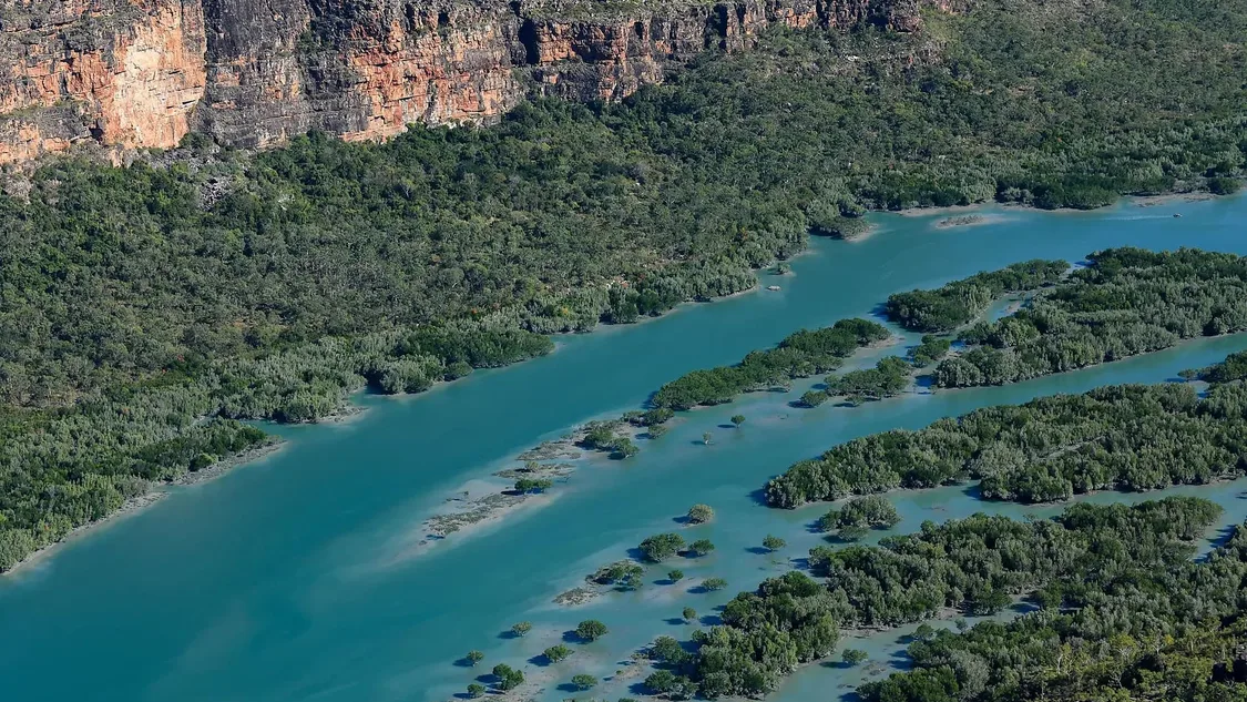 Arguably one of the most scenic parts of the Kimberley coast, Prince Frederick Harbour and the Hunter River are lined with ancient rainforest pockets, pristine mangroves and mosaic sandstone cliffs. They are considered to be some of the most pristine mangrove forests in the world, containing up to 18 different species, supporting a rich and diverse fauna. The sandstone escarpment at the river mouth, known as “Kampamantiya” rises over 200 metres high before giving way to extensive mud banks and mangrove forests home to numerous bird species and the iconic saltwater crocodile. Our expert Expedition Team will share their knowledge with you as you explore this pristine mangrove environment by zodiac keeping a constant lookout for wildlife. You will also have the opportunity to reach the Mitchell Falls by helicopter from Naturalist Island beach.