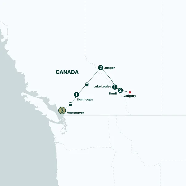 Transportation Two days Rocky Mountaineer in GoldLeaf Service from Vancouver to Jasper, Vancouver airport to hotel private transfer, Shared Vancouver hotel to train station, Jasper train station to Jasper Hotel and Banff Hotel to Calgary Airport transfers.
