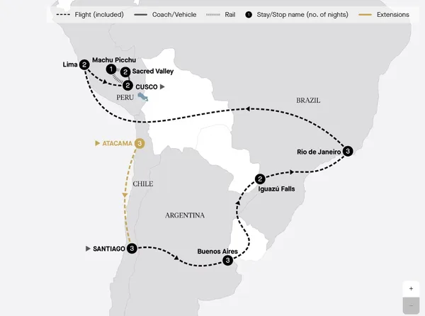 This journey dives into the heart and soul of Chile, Argentina, Brazil and Peru. Marvel at the scale and power of Iguazu Falls, venture into the Sacred Valley and discover the remarkable lost Inca citadel of Machu Picchu. You'll also experience the brilliant diversity of South America's cities with in‐depth explorations of metropolitan hubs including Santiago, Buenos Aires, Rio de Janeiro, Cusco and Lima.