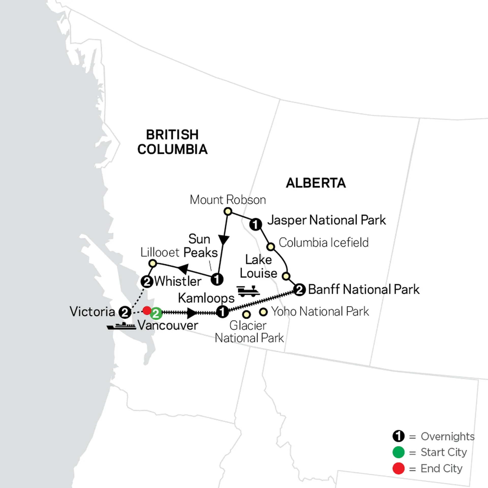 Visit gorgeous Lake Louise, where turquoise waters perfectly reflecting the surrounding mountains and glaciers. Then travel the stunning Icefields Parkway for a ride aboard the all-terrain Ice Explorer across ice that’s 750-feet-thick! Arrive in magnificent Jasper National Park with its majestic peaks and natural beauty and have the chance to take an optional scenic float trip down the Athabasca River. Journey to the base of 12,972-foot Mount Robson, the highest peak in the Canadian Rockies, on your way to the resort town of Sun Peaks. Follow the historic Gold Rush en route to Whistler where fur traders and prospectors pursued fortune. Take the ferry from Vancouver to Victoria and visit beautiful Butchart Gardens. Then have time to enjoy high tea at the Empress Hotel in this most British of Canadian cities or join an optional wildlife and whale-watching expedition in search of pods of orcas. Return via ferry to Vancouver and celebrate all the amazing memories you created on your vacation in Canada!