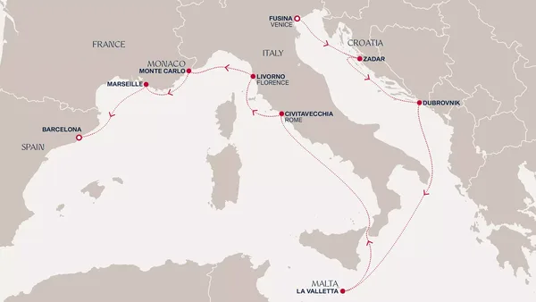 From bewitching Venice, we sail to Zadar’s cultural treasure trove and onwards to the epic beauty of Dubrovnik. Immerse yourself in Maltese history and architecture in La Valletta, then embrace delightful relaxation and elegance on board, as you drift into Rome’s ancient and modern wonders. Artistic delights await you when you venture to Florence. Afterwards, stroll through the glamour of Monte Carlo and the lively old harbour of Marseille, then arrive in the colourful culture of Barcelona.