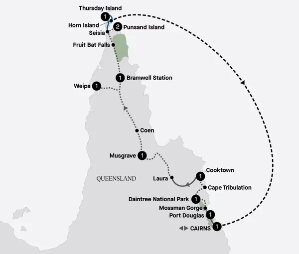 Observe the towering termite mounds of Bramwell Junction before continuing on with your adventure. Stop at Fruit Bat Falls and cool off with a refreshing swim in the pristine waters of the Elliott River. Cross Jardine River by ferry, then skirt Jardine River National Park and continue through the traditional land of the Injinoo Indigenous people.