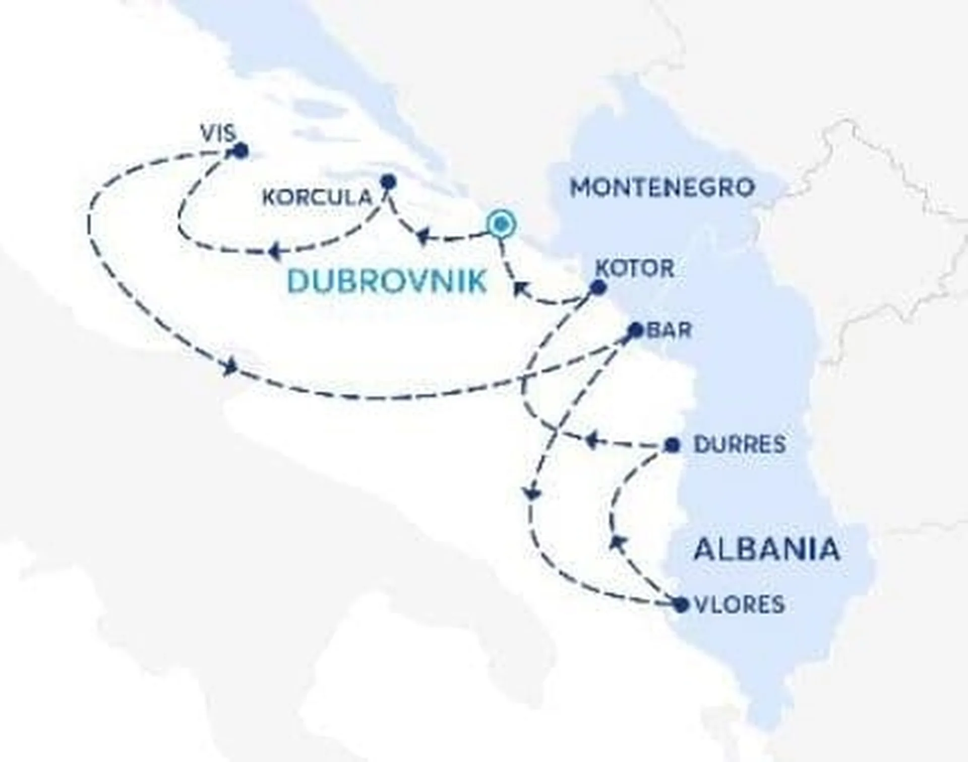 Embark on an odyssey of discovery on this unforgettable 8 day journey through the sparkling waters of the Adriatic Sea. You will visit 3 countries in a week, each adorned with historical treasures, scenic landscapes, and cultural marvels. Begin and end in Croatia, with her enchanting coastline dotted with medieval towns and ancient fortresses. From the charming streets of Dubrovnik, often hailed as the “Pearl of the Adriatic, ” to her unspoiled islands and amazing cuisine, you will be immersed in a rich tapestry of history and beauty. As the cruise sets sail towards Albania and Montenegro, anticipation mounts for the lesser explored gems of the Adriatic and Balkan region awaiting discovery.