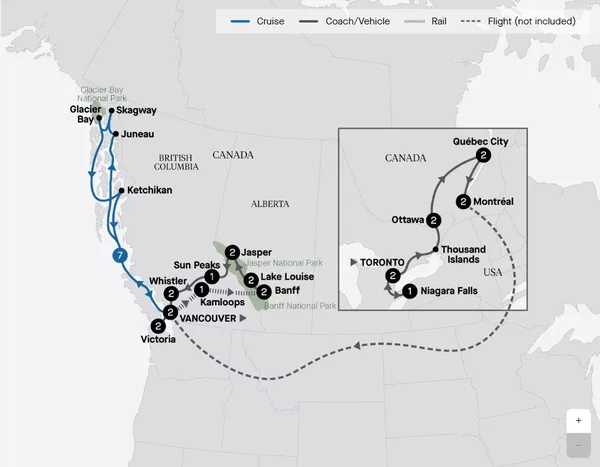 Experience the ultimate adventure with this all-encompassing journey. City hop through Eastern Canada, embark on a breathtaking Rocky Mountaineer rail journey, and cruise through the awe-inspiring Inside Passage. From coast to coast, explore stunning national parks, discover vibrant cosmopolitan cities, and indulge in world-class stays at opulent Fairmont properties.