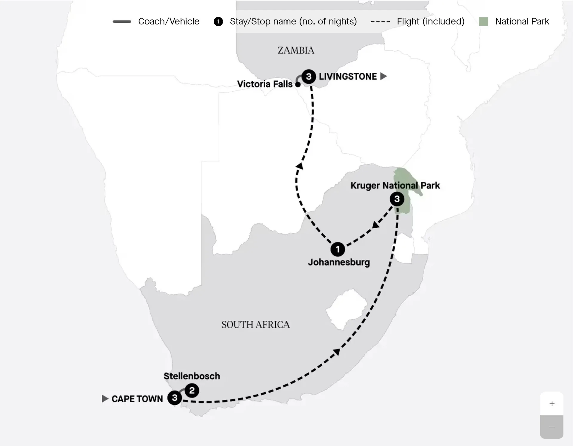 After breakfast, your spectacular journey through Southern Africa comes to an end. Transfer to the airport for your onward flight.