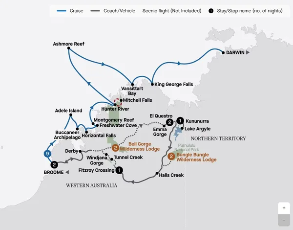 Begin in Broome and enjoy a stay at the renowned Cable Beach Club Resort & Spa. Venturing further inland, explore Windjana Gorge and Bell Gorge, and experience El Questro's natural wonders, from Emma Gorge to the thermal waters of Zebedee Springs. Out at sea, cruise to iconic wonders like King George Falls, Ashmore Reef and Vansittart Bay.