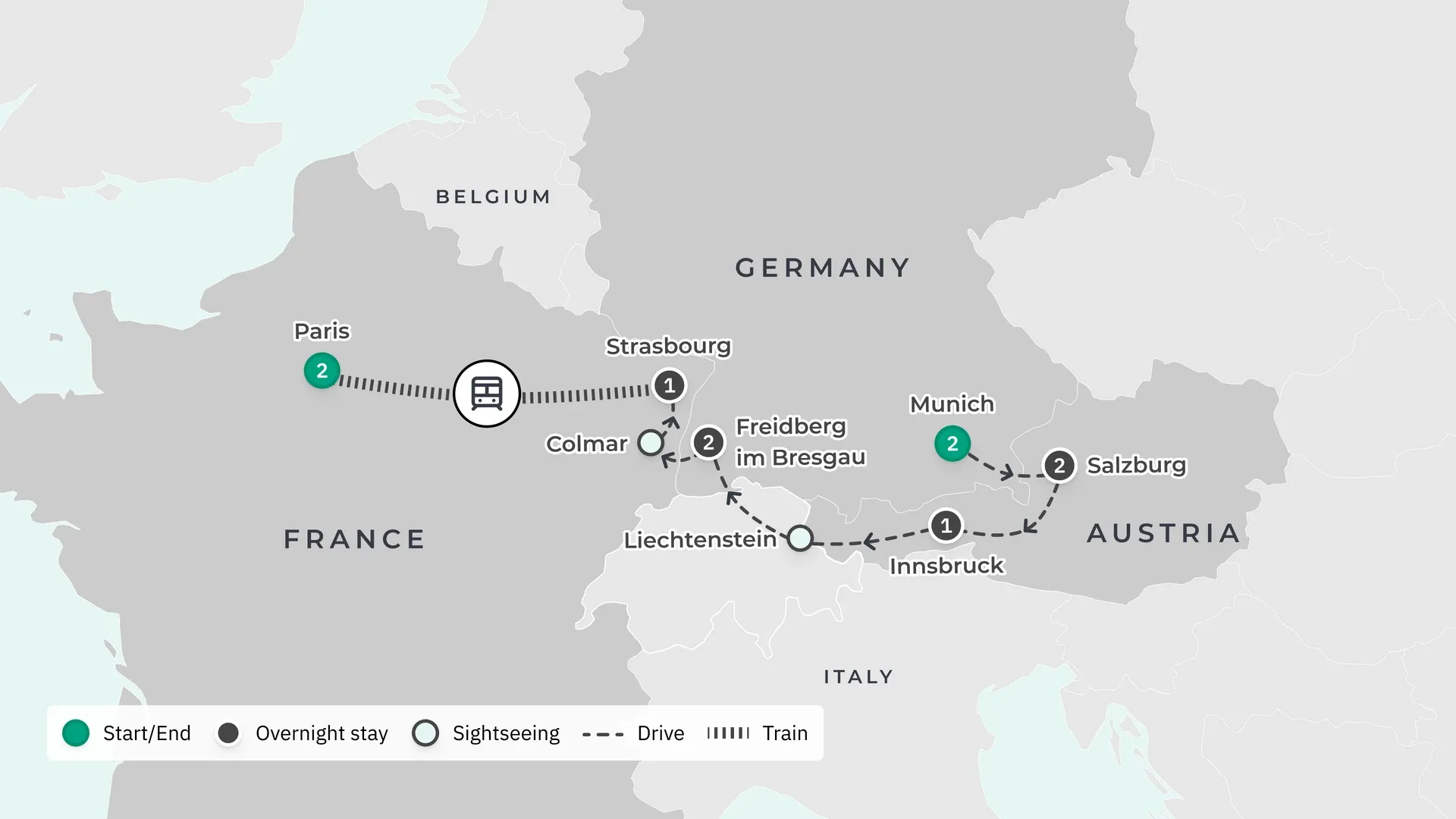 Munich → Salzburg → Innsbruck → Freiburg im Breisgau → Strasbourg → Paris