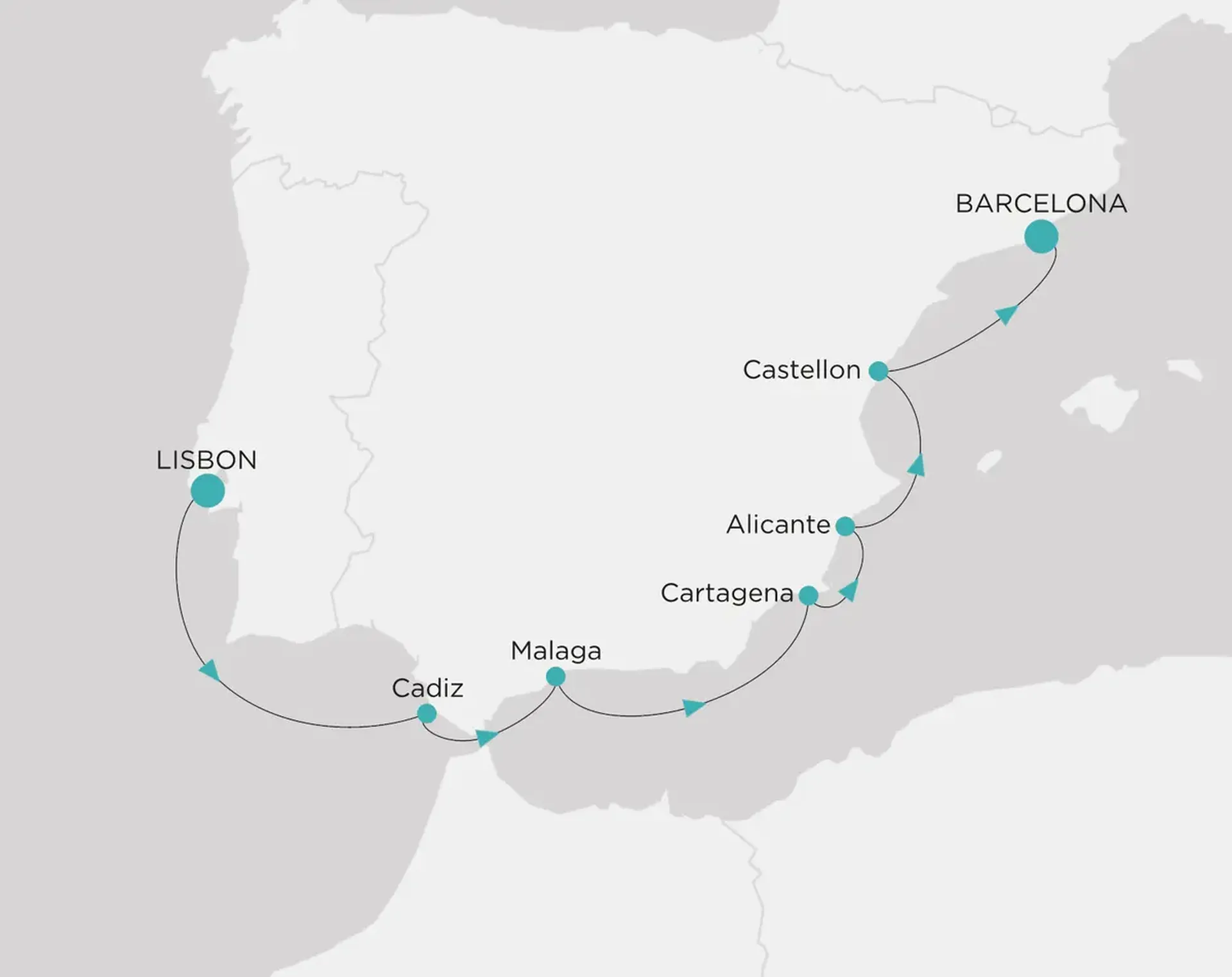 Tour the Iberian Peninsula on a voyage around the coasts of Portugal and Spain. Our cruise begins in Lisbon, the dynamic Portuguese capital, which is capturing hearts with its exquisite architecture, great nightlife – and those delicious custard tarts, pastel de nata. We relax into life at sea for a day as we cross the Spanish border to Cádiz. This beach city is a baroque beauty, where you can dine on some of the best seafood in Andalucia. Málaga comes next, another city graced with sandy shores. Find out about its famous son at the Picasso Museum. In Cartegena uncover the layers of civilization that stretch back here to 220BCE, including a Roman amphitheater. In Alicante, tuck into a paella – this is its birthplace – and go in search of a pirate’s lair at Tabarca. Castellon It’s our last stop before we reach Barcelona, the invigorating capital of Catalonia, our final destination.
