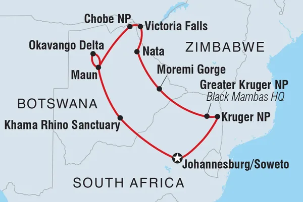 Spot your favourite safari animals on this 16-day Southern Africa adventure. Learn how the Black Mambas are deterring poachers on a bush walk through Greater Kruger National Park, visit the Khama Rhino Sanctuary and watch roaming wildlife like elephants, zebras and cheetahs on a scenic sunset river cruise. Cycle through the streets of Soweto with a local guide, camp under the stars in the heart of Botswana's Okavango Delta wilderness and enjoy plenty of free time to explore Victoria Falls at your own pace.