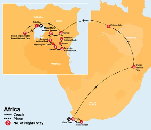 - Internal flights from Cape Town to Kruger, Kruger to Victoria Falls, Victoria Falls to Nairobi, Serengeti to the Masai Mara, Nairobi to Entebbe return and Bwindi to Entebbe