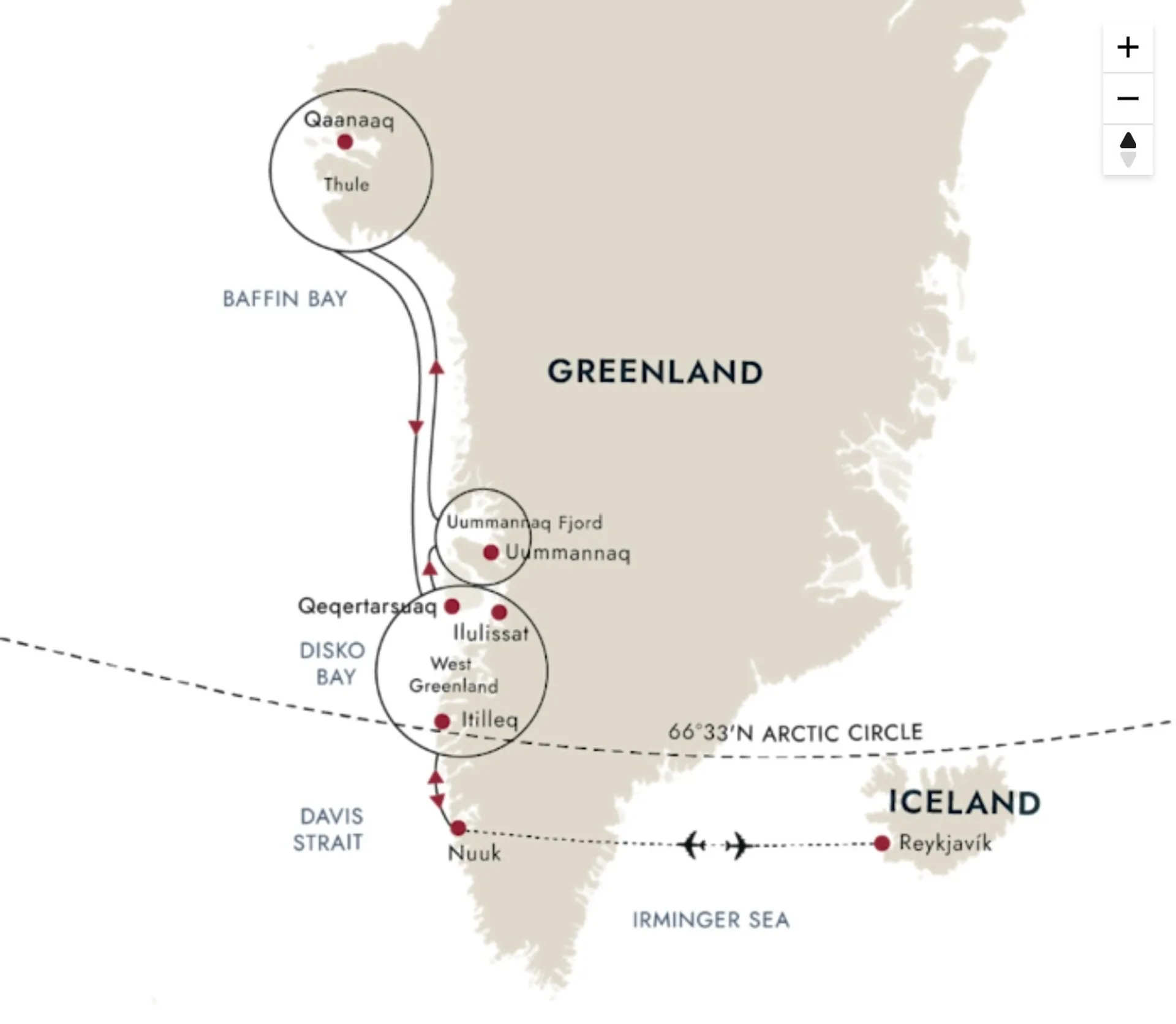 This voyage begins and ends in Nuuk with flights from/to Reykjavík. An option to fly from/to Copenhagen instead can be seen here.