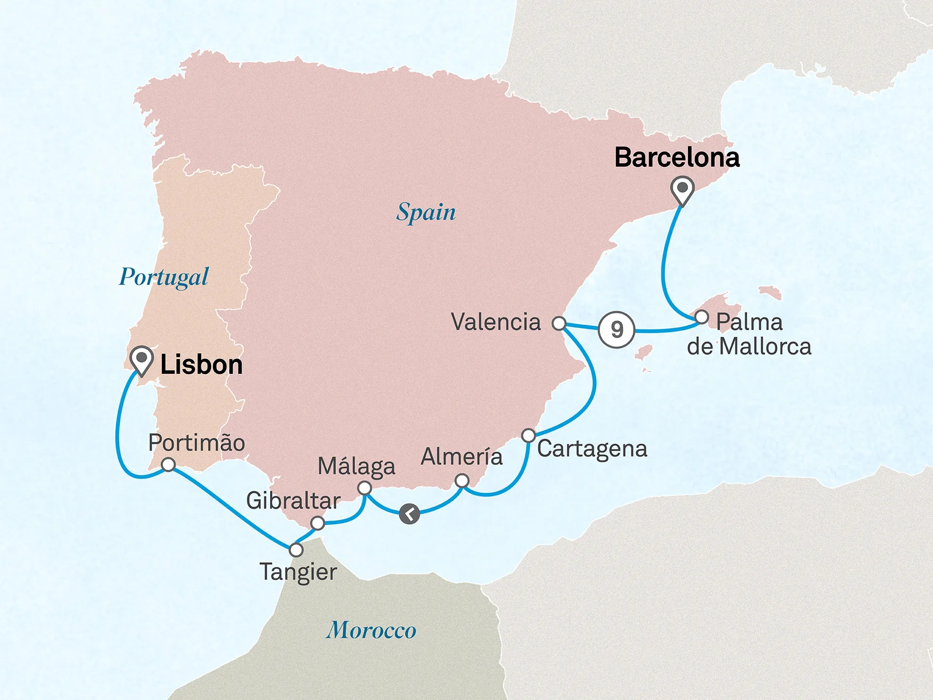 Embark on a captivating journey along the Mediterranean and Atlantic coasts, from vibrant Barcelona to historic Lisbon. Experience iconic cities and charming ports, highlighted by an exclusive overnight stay in Gibraltar, where the unique blend of British charm and Mediterranean spirit awaits beneath the famous Rock of Gibraltar.