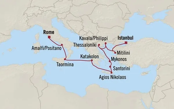 Your voyage begins in vibrant Istanbul, before weaving through the Greek Isles with calls at Mytilini, Kavala, and culture‑rich Thessaloniki. Continue to the glamorous shores of Mykonos and the dramatic volcanic landscapes of Santorini, then on to Agios Nikolaos and Katakolon, gateway to ancient Olympia.