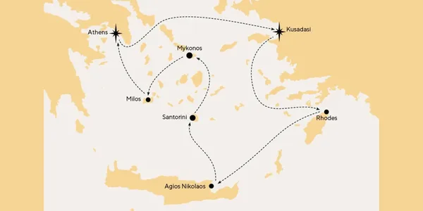 Get ready to experience the culture, cuisine and charm of the Greek islands and Ephesus in this 7-night adventure. Each island has its own distinct landscape and character, with captivating sights to admire and explore on every shore. Your journey begins in Kusadasi, with the opportunity to see one of the seven wonders of the ancient world, the Temple of Artemis. Then let the island-hopping begin! Cruise through turquoise waters to discover some of the most celebrated archaeological treasures: the Acropolis of Lindos in Rhodes, and the Palace of Knossos in Crete with its tales of the legendary minotaur. Soak up the sunset in stunning Santorini and experience both the peace and party vibe of magical Mykonos. Then take a relaxing day in tranquil Milos before heading back to Athens. With fascinating excursions to choose from at every port, this is an unforgettable journey around the highlights of Greek island life.