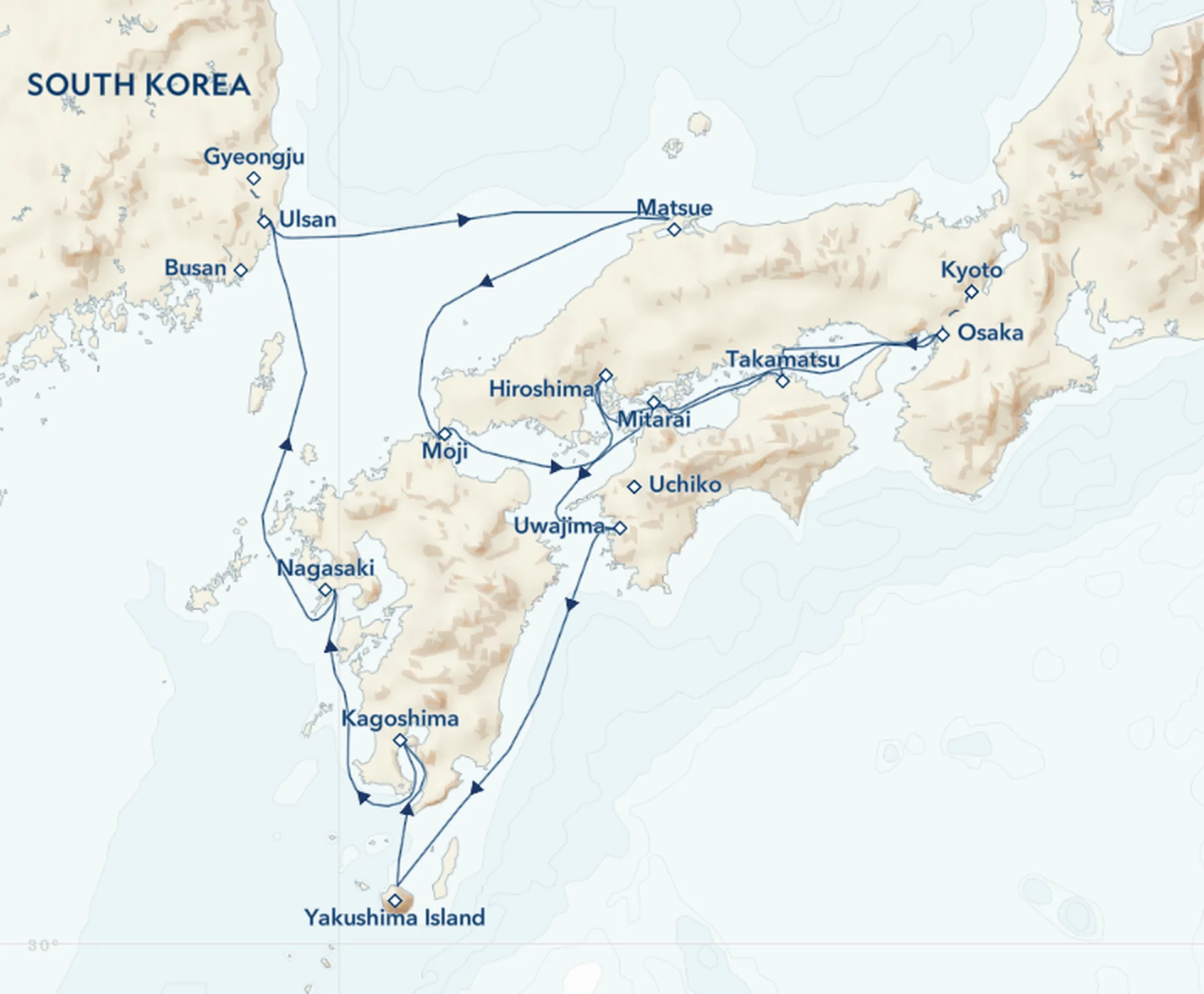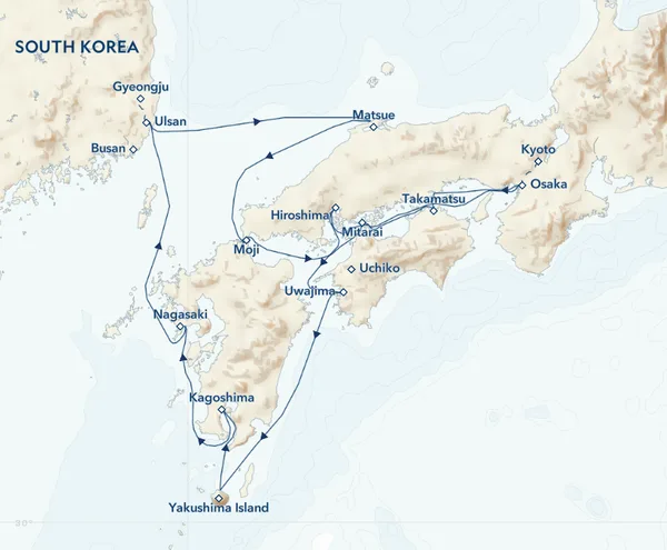 The diverse ecology of Yakushima Island, including a subtropical coast and temperate rainforest in the interior, has earned this island World Heritage status. On a hike, discover the island’s ancient Yakusugi cedar trees, many of which date back more than a thousand years. Back on board the ship in the evening, head north toward the island of Kyushu.