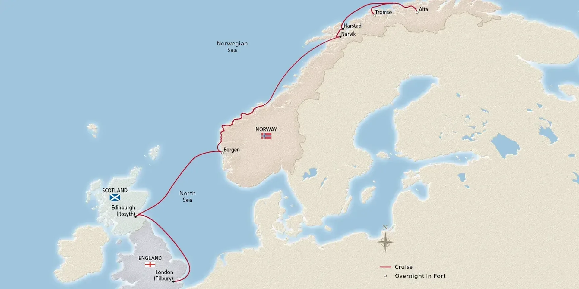 Sail north to an Arctic landscape defined by silence and snow. Clear nights may reveal the elusive northern lights as solar particles collide with Earth’s atmosphere casting vibrant, dancing colors across the sky. Here, age-old Sami traditions thrive in everyday life through reindeer herding and dogsledding. In Tromsø, the Arctic Cathedral’s modern silhouette rises above the fjord, a luminous landmark amid the dark of winter.