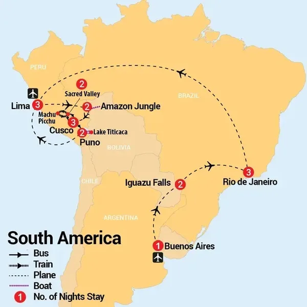 Discover South America's essence on this 19 Day adventure through Argentina, Brazil, and Peru. Highlights include Iguazu Falls, Machu Picchu, and a two-night Amazon stay in an eco-friendly lodge. Visit Lake Titicaca's indigenous communities and experience the vibrant cultures of Buenos Aires, Rio de Janeiro, and the Sacred Valley's ruins.