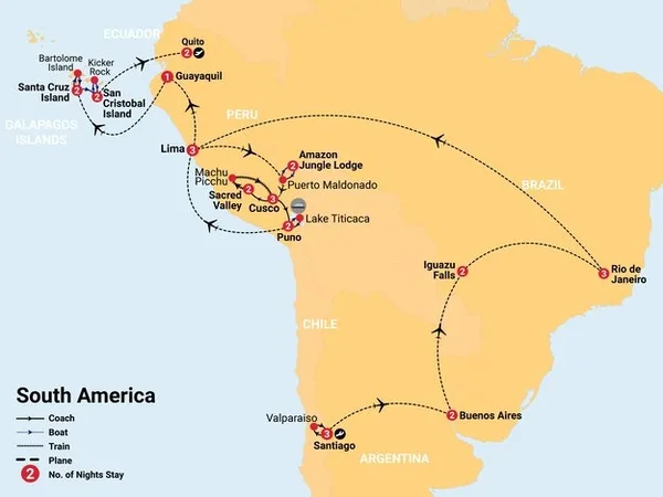 Embark on a vibrant journey through South America, beginning in Santiago’s rich history. Explore Buenos Aires' tango-filled streets, then marvel at Iguazu Falls. Soak in Rio's iconic beaches and Christ the Redeemer, before discovering Peru's ancient wonders like Machu Picchu. Conclude in the serene, wildlife-rich Galapagos Islands.
