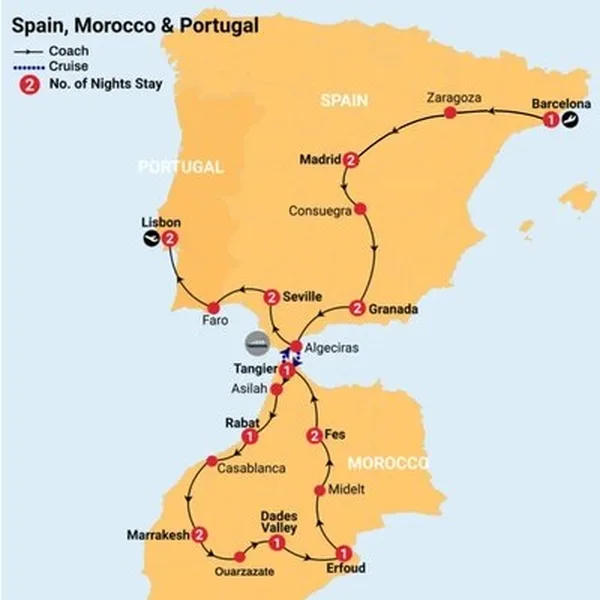 Journey through Spain, Morocco and Portugal on this unforgettable adventure! Marvel at Madrid’s Palacio Real, wander Zaragoza and Consuegra, explore Alhambra and Granada, stand in awe at Casablanca’s Hassan II Mosque, get lost in Marrakech’s Old Medina, and soak up Seville and Lisbon’s charm. An adventure like no other awaits.