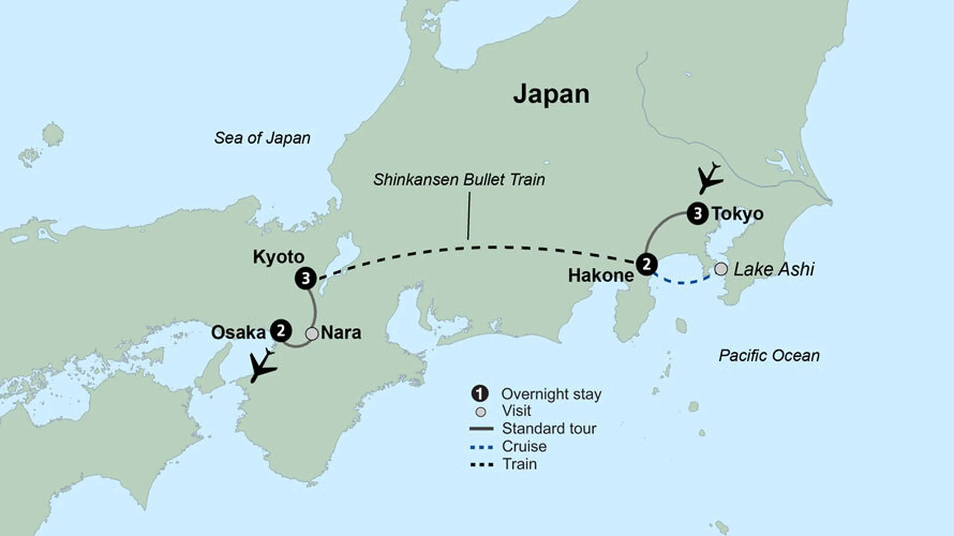 Discover the heart of Japan’s urban landscapes and natural wonders, from Tokyo’s electric energy to Kyoto’s Zen serenity. Stroll through the iconic torii gates of Fushimi Inari and under the Ancient Cedar Avenue of Hakone. Gain understanding of local customs during a stay in a traditional ryokan (Japanese inn). Ride the shinkansen (bullet train) from Hakone to Kyoto. Encounter Nara’s sacred deer, visit Mt. Fuji 5th Station, explore Osaka’s vibrant food scene, and craft your own sushi. Experience sacred rituals, from a Goma fire ritual to sipping green tea inside a temple. Along the way, discover the art, flavours, and spirit that make Japan unforgettable.
