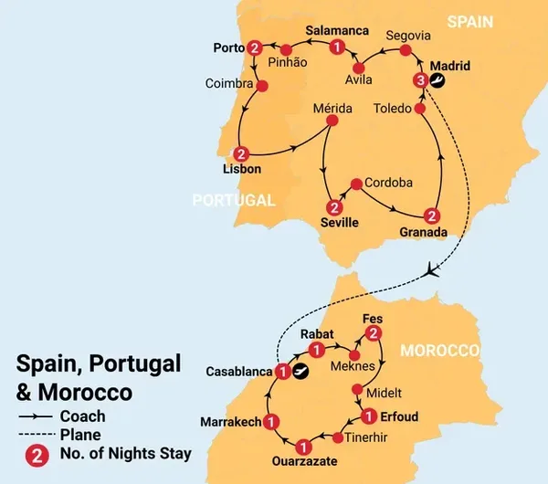 Discover Spain, Portugal, and Morocco on this spectacular 20 Day small group tour. From Madrid's iconic Gran Via to Lisbon's Belem Tower and Morocco's Hassan II Mosque, experience UNESCO cultural highlights like the Alhambra Palace and Marrakech's Jemaa el-Fnaa. Savour authentic cuisines, local gems, and rich histories along the way.