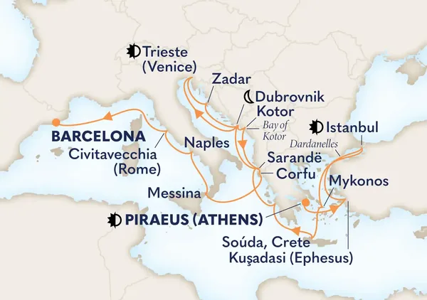 The HISTORY® channel exclusively curated itinerary: Let the sea carry you to beautiful ports across Italy, Spain, Greece and Turkey. Stay overnight in the ancient city of Naples and scenic cruise through the Strait of Messina.