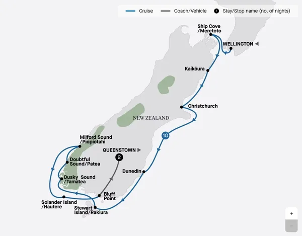 Find a comfortable place on deck or in the observation lounge, and watch as the captain navigates a narrow passage of the fiord known as 'The Gut' from Thompson Sound into Doubtful Sound. 'Patea' (Doubtful Sound) meaning ‘place of silence’ in Māori, spans a staggering 40 kilometres (25 miles) from the head of the fiord to the Tasman Sea. It is the deepest of New Zealand’s 14 fjords and its enormity leaves all who visit feeling humbled and in awe of its powerful presence. The fjord branches into three arms and offers impressive waterfalls that provide shelter to New Zealand’s southernmost population of bottlenose dolphins and tawaki , the Fiordland crested penguin. An easy short walk between Deas Cove and Neck Cove offers the chance to see unique local flora and fauna. Alternatively, embark on a thrilling cruise aboard your tender vessel, exploring the coastline of the fjord and hearing tales of local history.