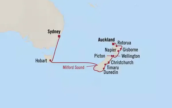 Set sail on an enriching journey through New Zealand’s most captivating coastal regions, from vibrant Auckland to the harbour city of Sydney. Discover Māori culture and geothermal landscapes in Rotorua, Art Deco elegance in Napier, and the charm of South Island ports including Picton, Christchurch and Dunedin. Experience the breathtaking drama of Milford Sound’s fjords before crossing the Tasman Sea to historic Hobart. This thoughtfully curated voyage blends natural beauty, cultural depth and scenic cruising, all enjoyed in refined comfort and effortless style.