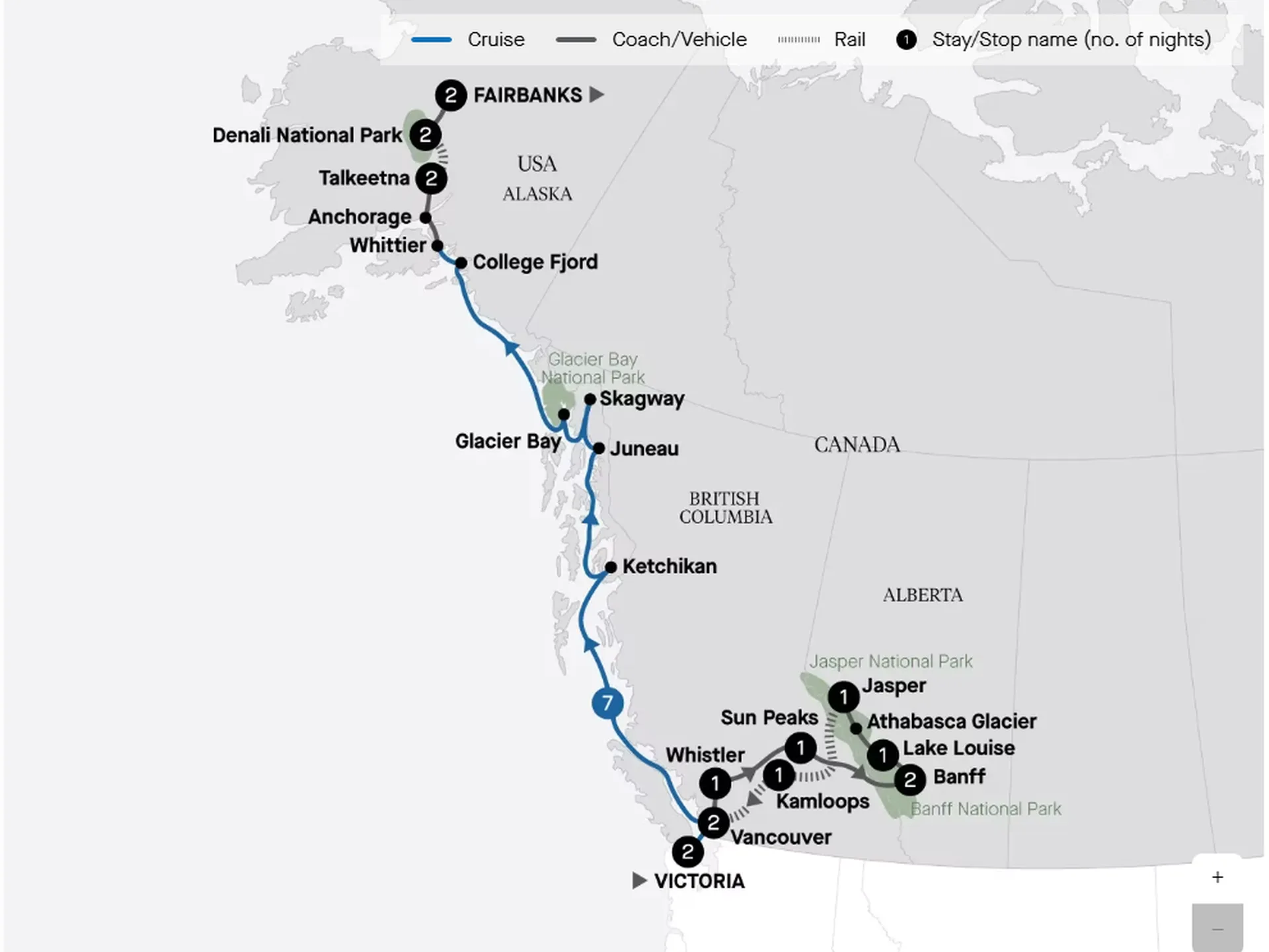 Immerse yourself in the spectacular beauty of Canada and Alaska on this 25-day tour. Visit charming Victoria and admire natural wonders in Banff. Be whisked through national parks to Vancouver on a Rocky Mountaineer rail journey. Then, cruise through Alaska’s Inside Passage before exploring rugged landscapes, including Denali National Park.