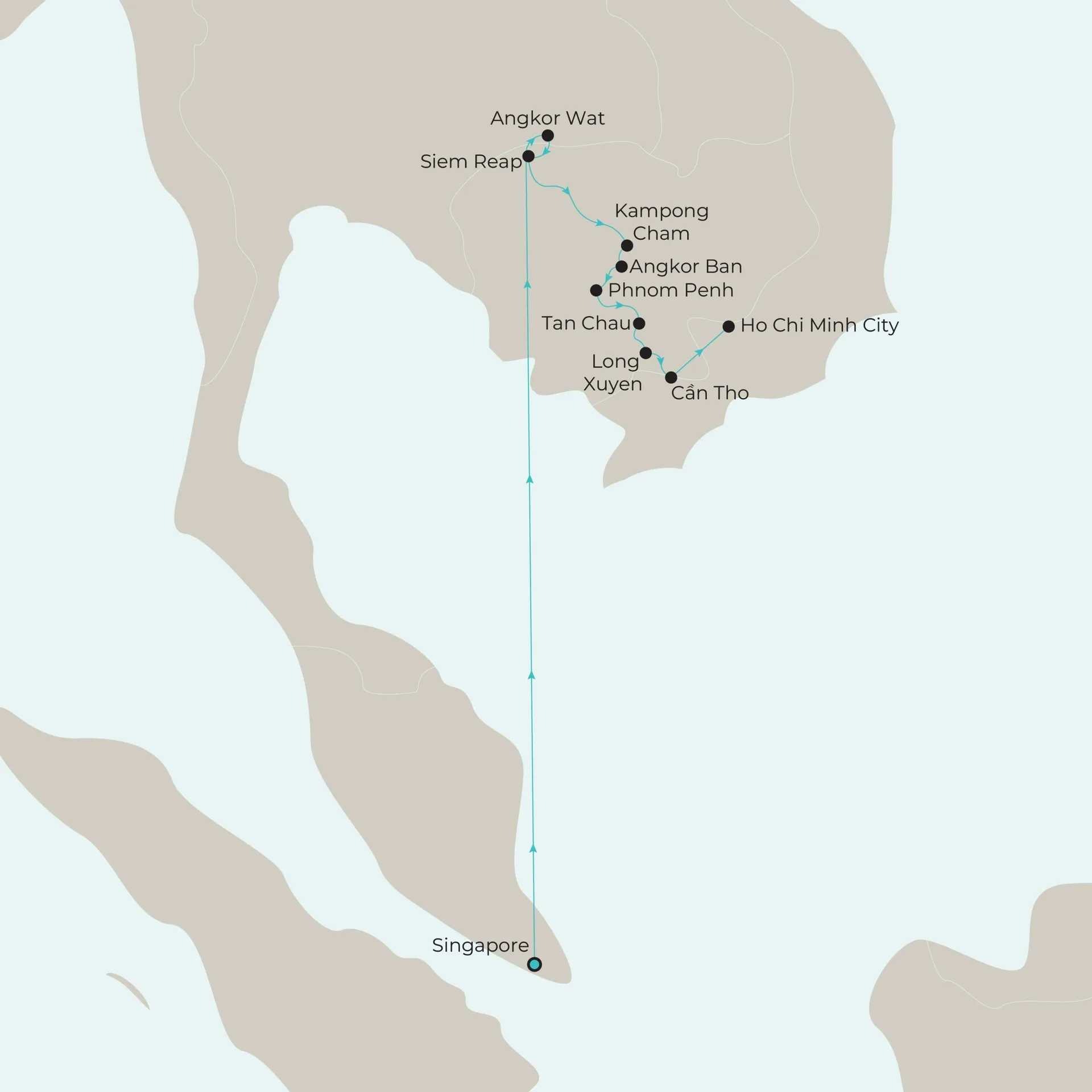 Overnights in port in Angkor Ban, Koh Chen, Phnom Penh, Vam Nao, Long Xuyen and Can Tho