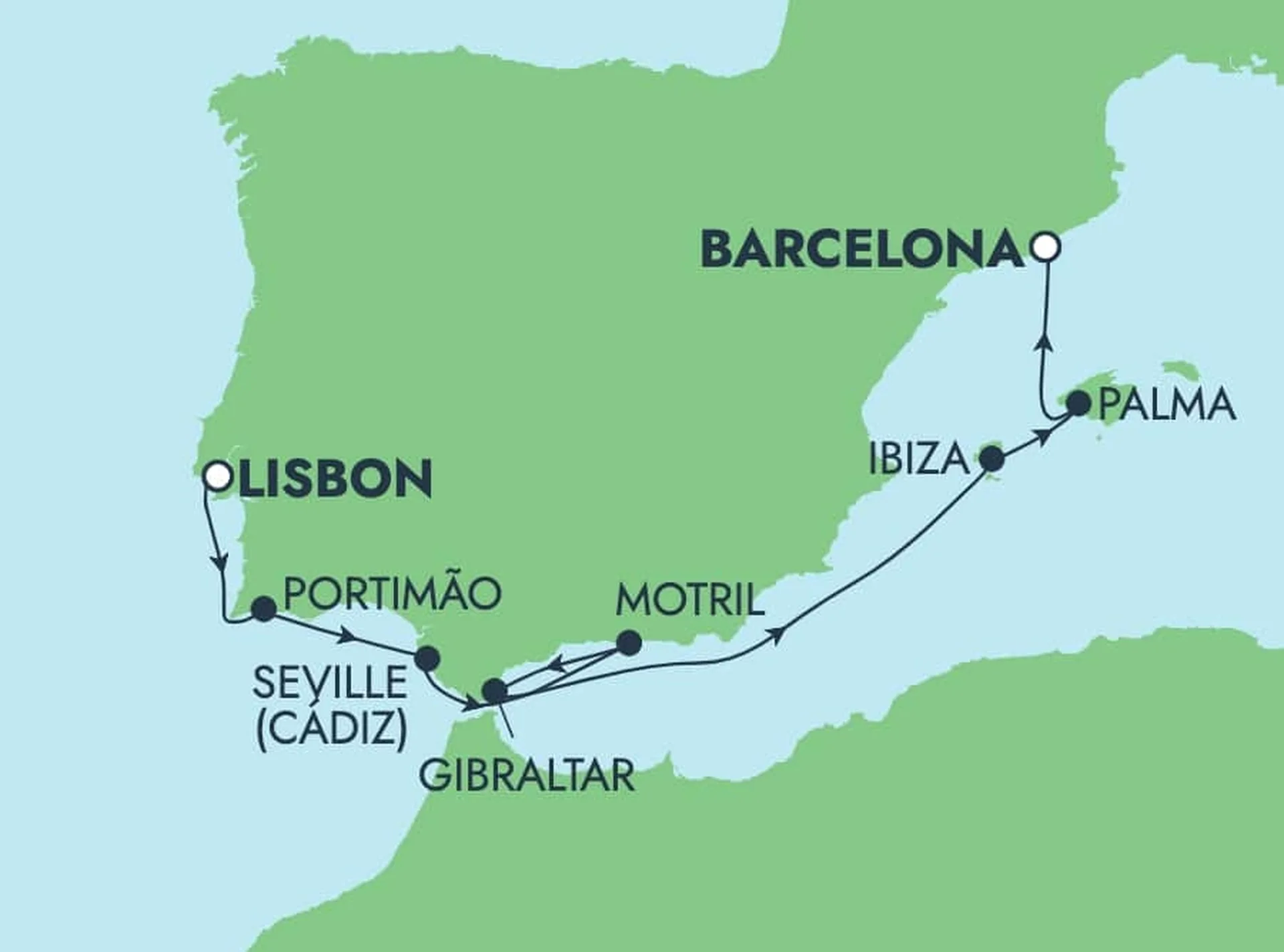 Once you leave the narrow streets and traditional Fado music of Lisbon behind, you'll embark on a 7-day holiday you must experience to believe. In Portimão, choose between an off-road adventure through the stunning Serra de Monchique Mountain range or take in the ancient ruins of Silves Castle. Enjoy a scenic drive around Gibraltar, visiting Catalan Bay, Trafalgar Cemetery, and Europa Point, before savouring tapas and wine. Finally, see the sunny side of life at Ibiza's Playa d'en Bossa, a scenic beach perfect for sunbathing and water activities.