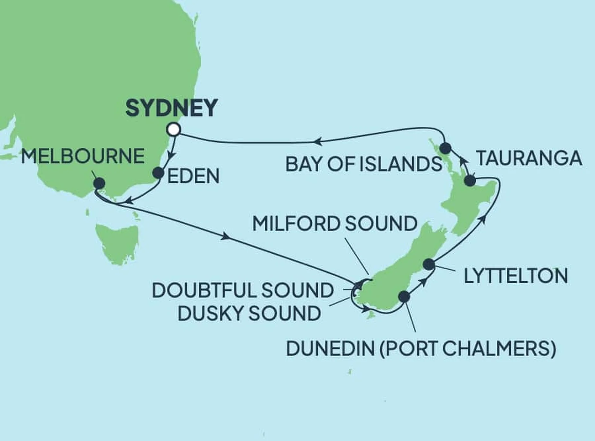 Take off for a luxurious 14-day holiday, where two full weeks promise more moments to relax, explore, and immerse yourself in breathtaking destinations. Begin in Sydney, then set sail for Melbourne, a city steeped in culture and charm. Wander through artsy laneways, discover one-of-a-kind boutiques, or find serenity in the Royal Botanic Gardens. Crossing the Tasman Sea, arrive in Dunedin, New Zealand, a city alive with Scottish heritage and wild natural beauty. Wander the halls of historic Larnach Castle or journey through the Otago Peninsula, home to rare wildlife and stunning views. In Tauranga, soak in New Zealand's coastal magic as you stroll along golden beaches or venture to Rotorua to delight in its geothermal wonders.