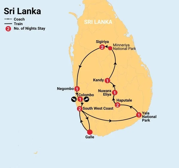 This 12-day journey through Sri Lanka takes in history, wildlife, and enchanting landscapes. Wander Colombo’s vibrant streets, marvel at Galle Fort, and unwind on South West Coast beaches. Tick off Yala and Minneriya national parks, Nuwara Eliya’s tea country, and experience cultural performances in Kandy and ascend Sigiriya Rock Fortress.