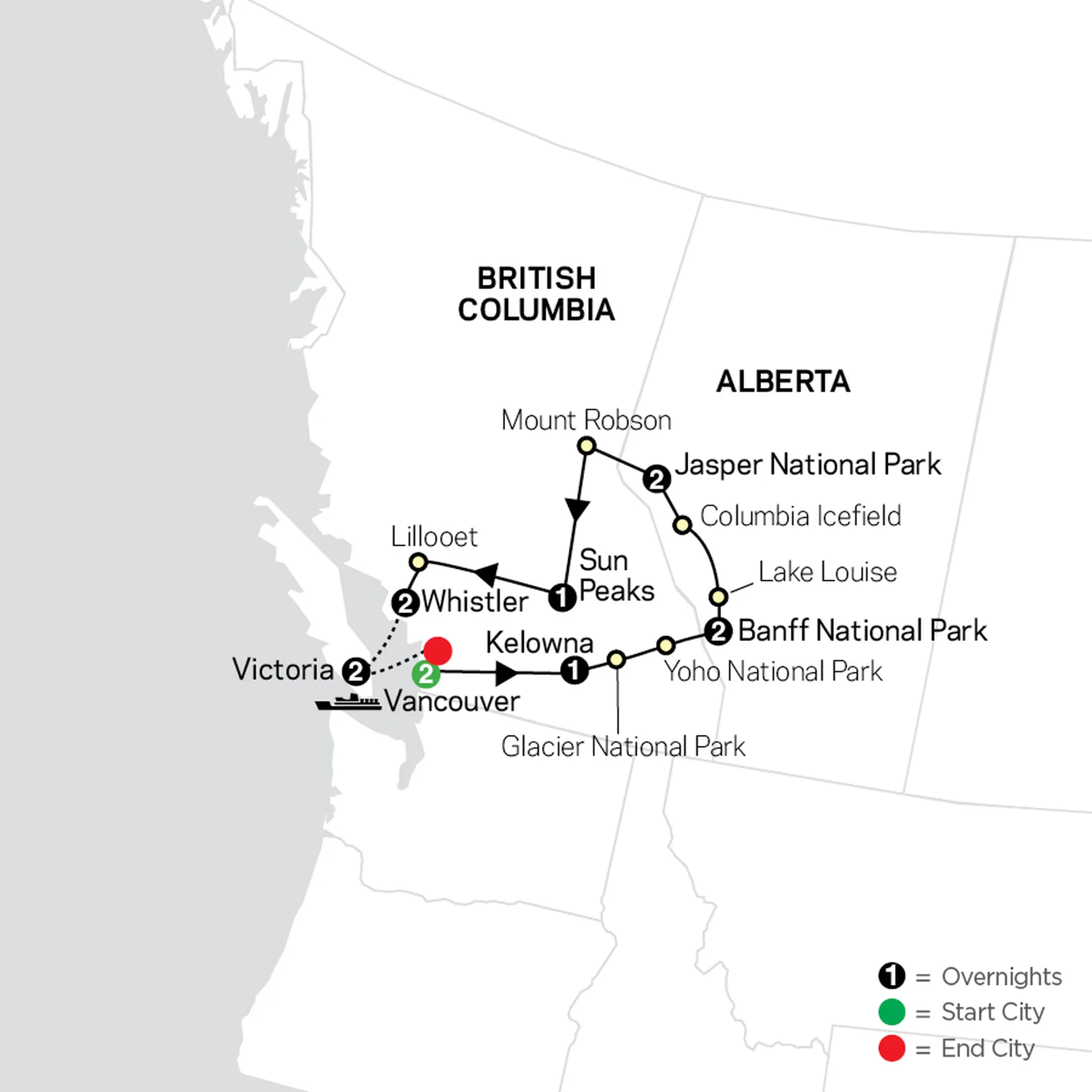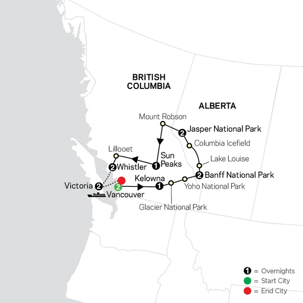 Spectacular national parks and scenic drives highlight this wonderful Canadian Rockies tour featuring Vancouver, Kelowna, Banff National Park, Jasper National Park, Sun Peaks, Whistler, and Victoria. Begin in vibrant Vancouver where city sightseeing includes Stanley Park and other famous landmarks. Continue to Kelowna on the shores of Okanagan Lake amid orchards and vineyards. Climb Rogers Pass in Glacier National Park, then enter Yoho National Park and ascend Kicking Horse Pass to arrive in breathtaking Banff National Park.