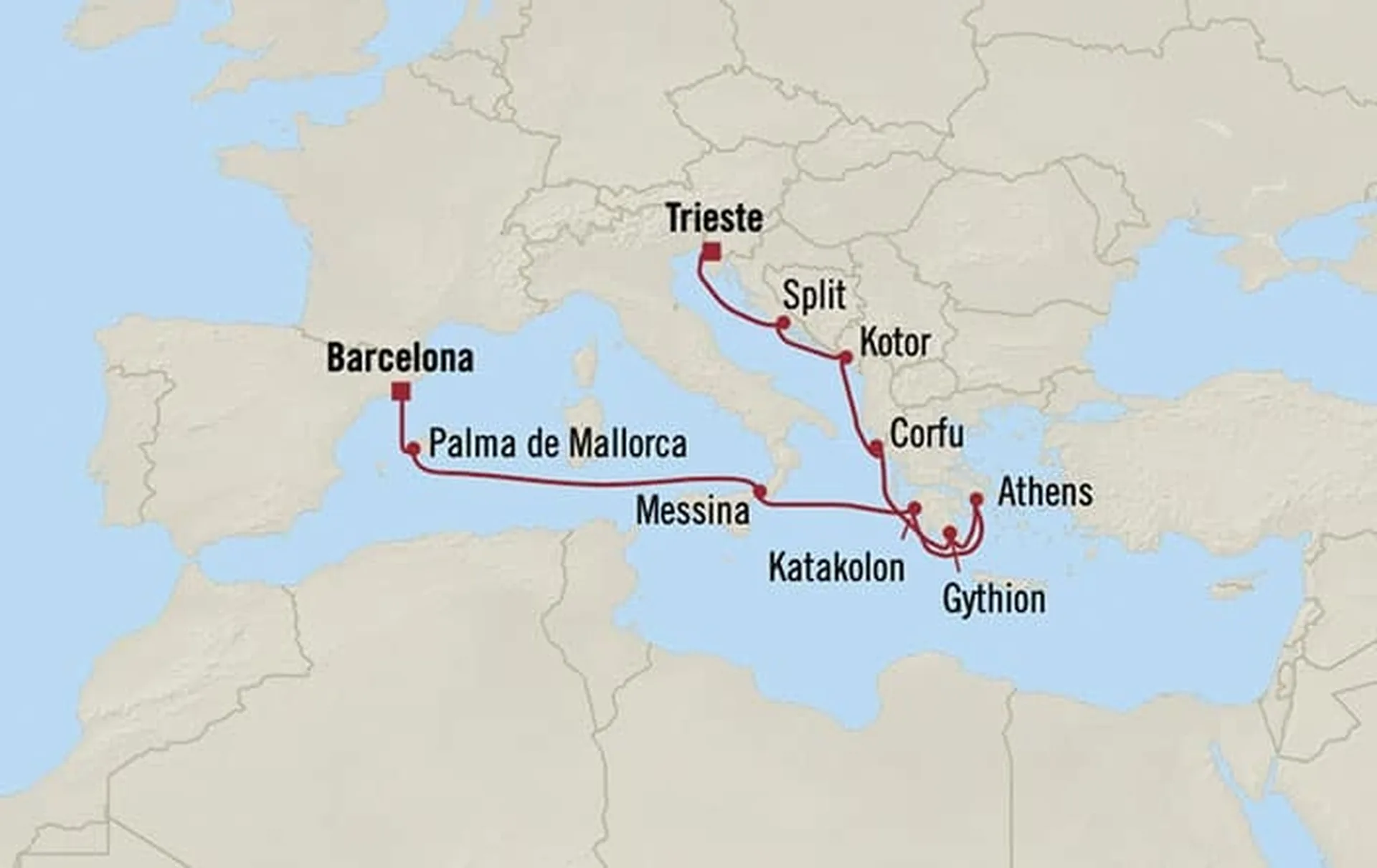 Weave through the Adriatic and Ionian Seas with stops in Split, Kotor, Corfu, and Gythion, each offering its own blend of history, mythology, and seaside charm. Continue to Athens and Katakolon, where classical Greece comes to life, before crossing to Messina in Sicily. After a relaxing day at sea, soak in the Balearic spirit in Palma de Mallorca before concluding in Barcelona, one of Europe’s most iconic cities
