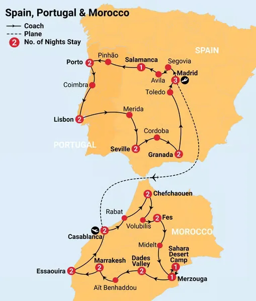 Embark on a 27-day adventure through Spain, Portugal, and Morocco. Explore iconic cities like Madrid, Porto, Lisbon, and Seville, plus UNESCO sites and Alhambra Palace. Discover Morocco's stunning landscapes, including the Sahara and Atlas Mountains, and immerse yourself in local experiences, from camel rides in the Sahara to enjoying a meal with a Moroccan family on their farm.