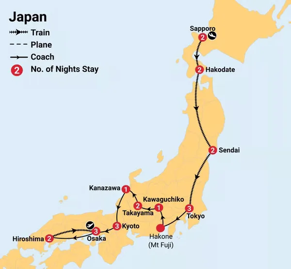 Day 3 → Sapporo → Hakodate Board the train to Hakodate, travelling through scenic countryside. The afternoon is free—consider a cable car ride up Mount Hakodate for panoramic night views. Overnight: Hakodate Meals: Breakfast