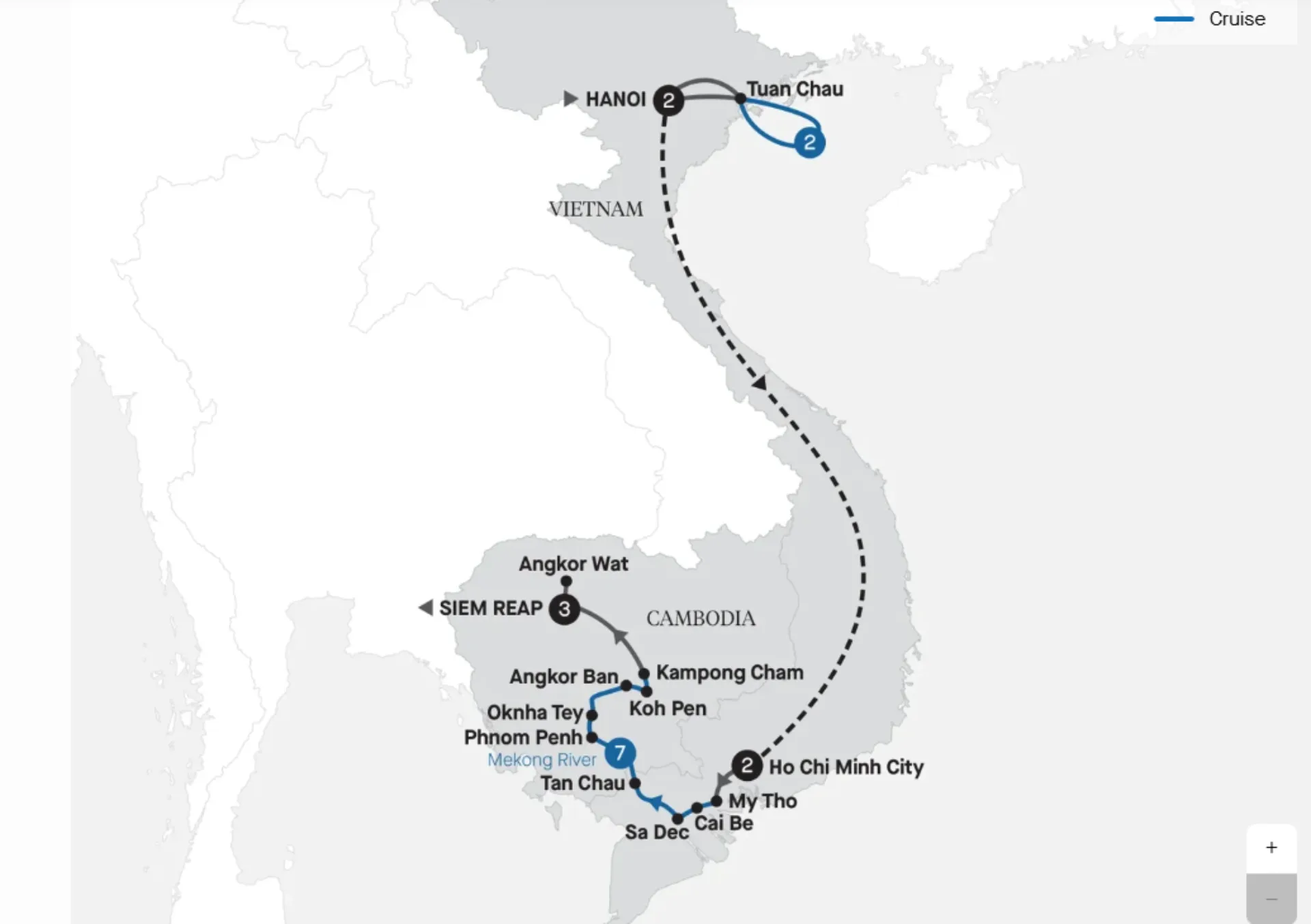 Explore Vietnam and Cambodia in depth, beginning in fascinating Hanoi. Discover Ha Long Bay on a three-day luxury cruise and see bustling Ho Chi Minh City. Then spend seven nights on the Mekong River aboard the luxurious Mekong Serenity. See Phnom Penh and charming riverside villages en route to Siem Reap and the majestic Angkor Wat.