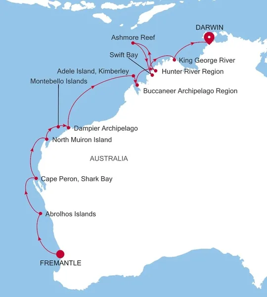 Join us for one of Australia’s most sought after journeys, of iconic wildlife, thundering waterfalls, and sparkling waters. Departing Perth, sail the converging waters of the Indian and Southern oceans, where corals, sharks, and turtles thrive. Land expeditions and Zodiac rides reach the heart of diverse archipelagos and ecosystems. Kimberley’s ancient sandstone cliffs reveal rock art, wild beauty and potential humpback sightings - ahead of Darwin's tropical shores.