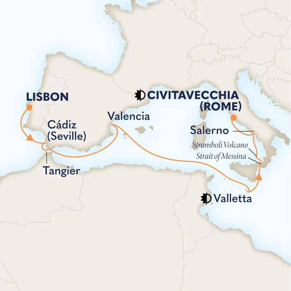 One cruise with many possibilities: Acquaint yourself with Andalusian culture in Cádiz, uncover the secrets of the Kasbah of Tangier, explore the ancient city of Valletta, and marvel at Rome’s Colosseum.
