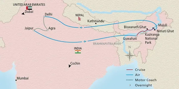 Delve into the rich history of India’s Golden Triangle, exploring Agra’s fabled Taj Mahal, strolling through Old Delhi’s winding streets and glimpsing Jaipur’s ornate Palace of Winds. See Guwahati’s temple, sail the Brahmaputra River and encounter the thriving villages along its banks. Search for the one-horned rhinos and buffalos of Kaziranga National Park and discover the cultures of Majuli, one of the world’s largest river islands.